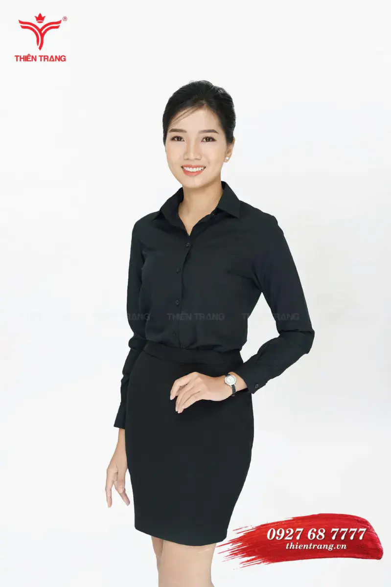 Đồng phục sơ mi nữ tư vấn viên spa TTDNGASM2 màu đen là mẫu đồng phục tư vấn viên spa được thiết kế với áo sơ mi và váy đen tạo nên sự thanh lịch và chuyên nghiệp. Nút áo sơ mi màu đen cũng giúp cho bộ đồng phục spa trở nên trang trọng và lịch sự hơn.
