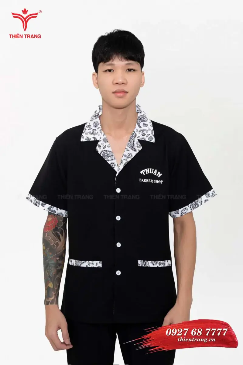 Áo sơ mi Barber TTBBESMBB24 màu đen hoa văn là mẫu áo sơ mi đồng phục Barber, đây là sự kết hợp hoàn hảo giữa phong cách hiện đại và sự sang trọng. Với gam màu đen tinh tế và hoa văn tinh xảo, đây là điểm nhấn tạo nên sự khác biệt với các mẫu đồng phục khác.