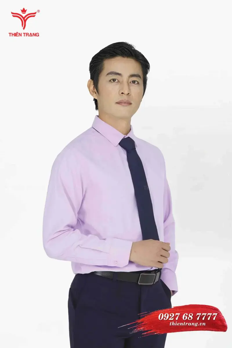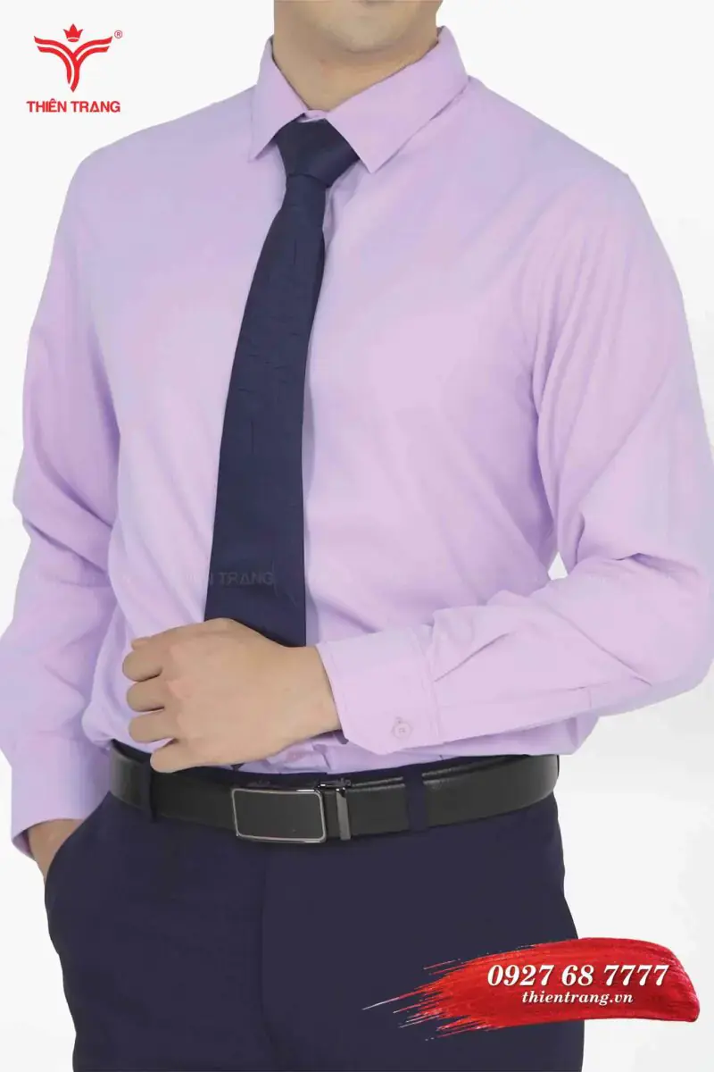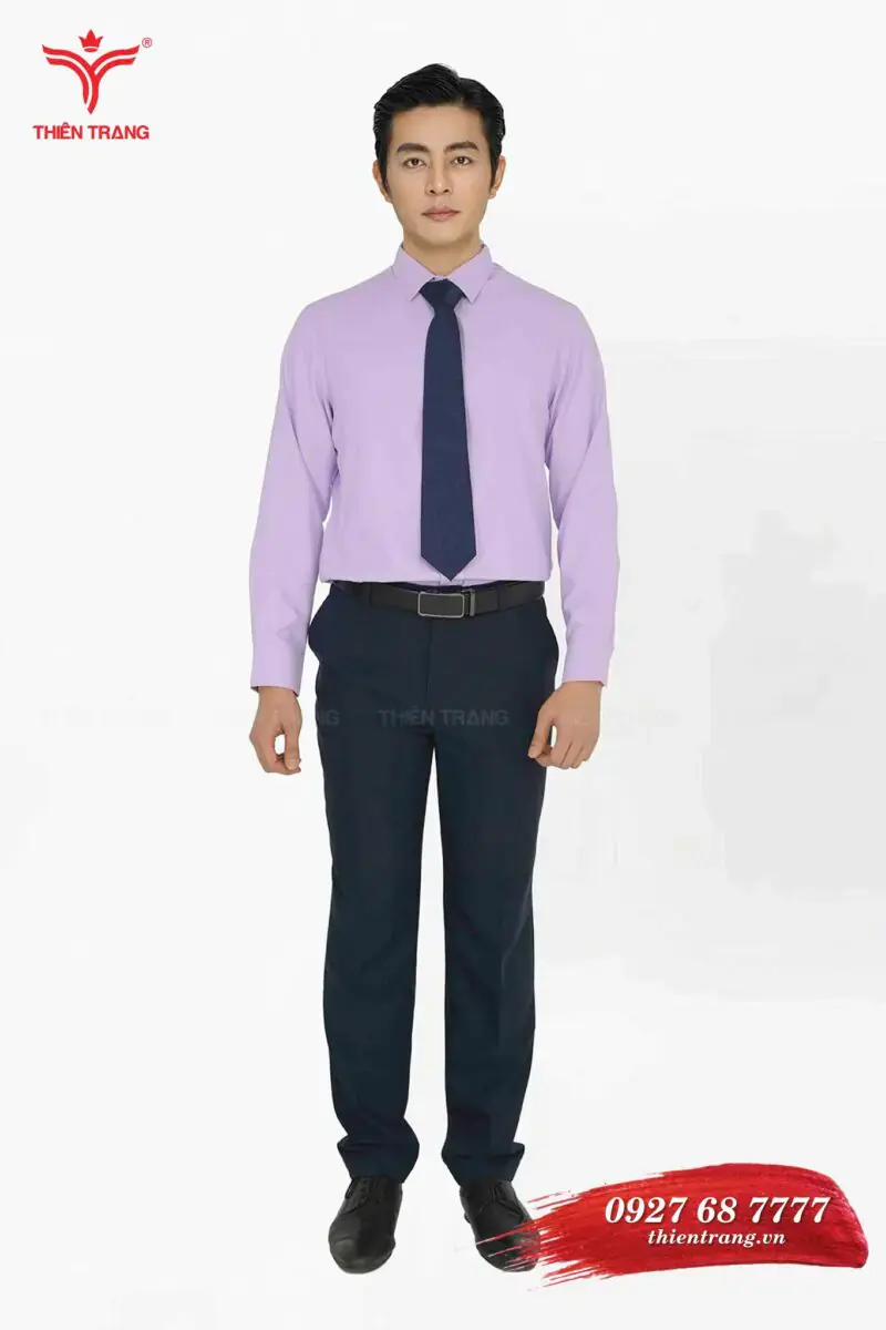 Áo sơ mi công sở nam TTDNGASMDNM4 màu tím là mẫu áo sơ mi đồng phục nam được phối từ cà vạt xanh ngọc, quần Tây xanh tạo nên một bộ đồng phục áo sơ mi chuyên nghiệp và lịch thiệp.