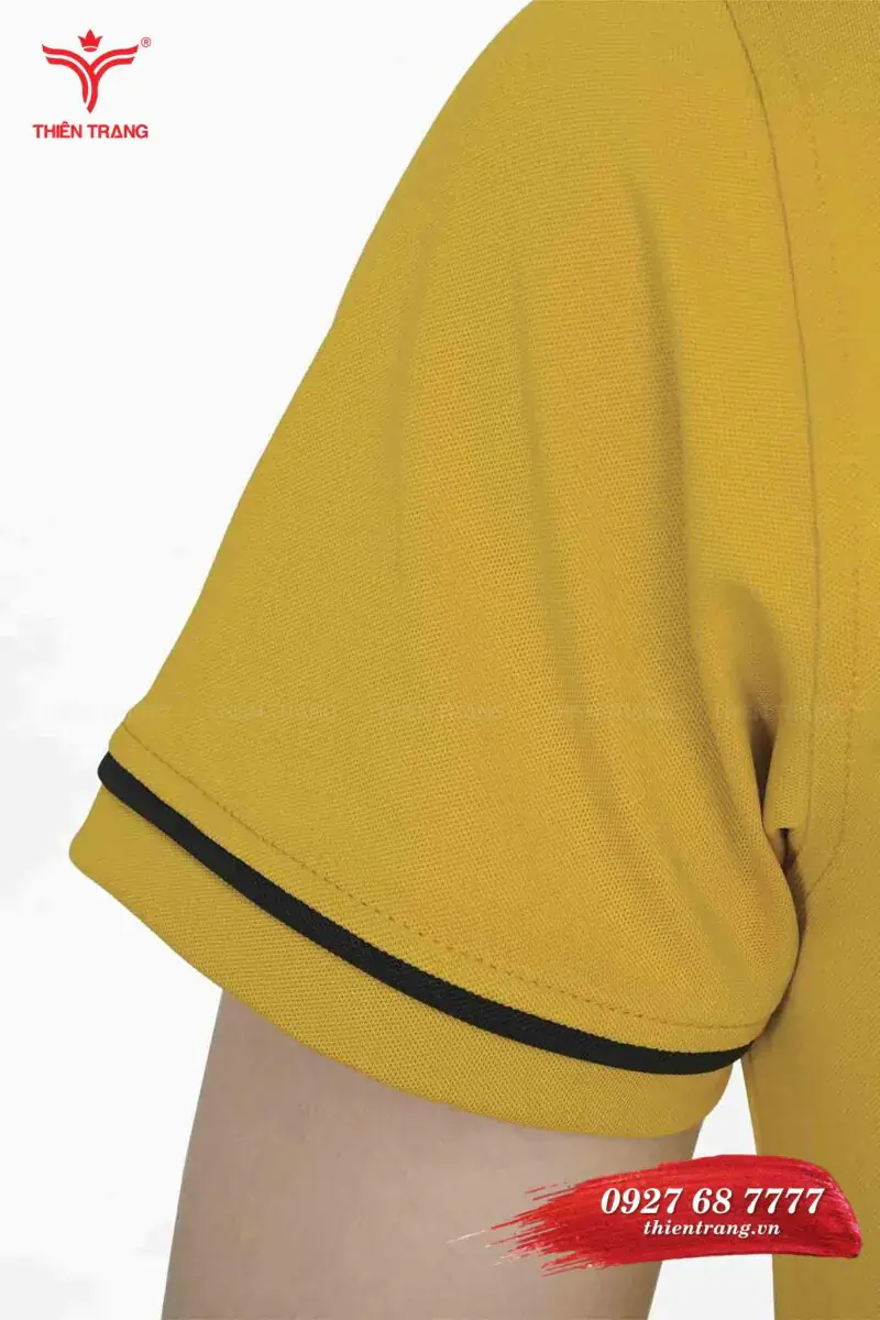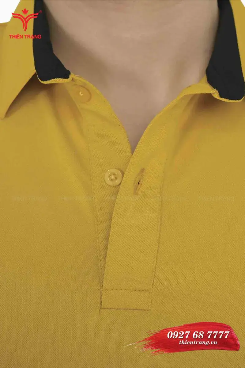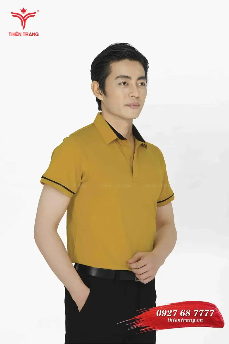 Áo thun công sở nam TTDNGATDNM10 màu vàng là sự kết hợp giữa áo thun công sở nam màu vàng và quần Âu đen giúp tạo nên một bộ đồng phục áo thun thanh lịch.