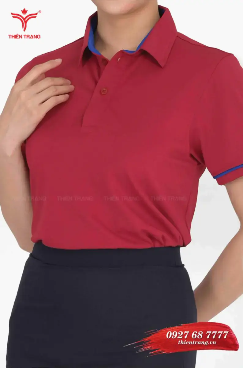 Áo thun công sở nữ TTDNGATDNWM7 màu đỏ là mẫu áo thun đồng phục nữ màu đỏ kết hợp với chân váy ngắn đen giúp tạo nên một bộ đồng phục áo thun có màu sắc nhẹ nhàng và thanh lịch.