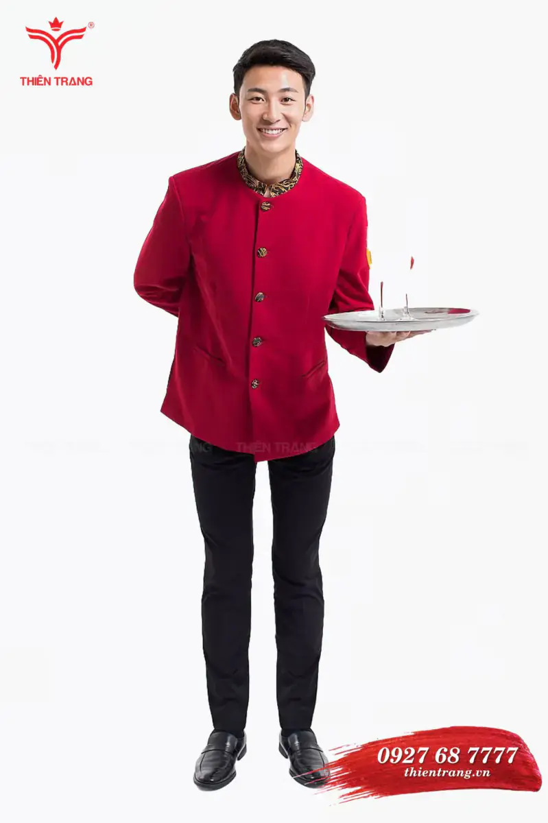 Đồng phục nhà hàng Hoa TTNHANHHM7 màu đỏ là mẫu đồng phục nhà hàng Hoa với tone màu đỏ chủ đạo mang phong cách Trung Hoa truyền thống, tạo nên không gian độc đáo, thu hút