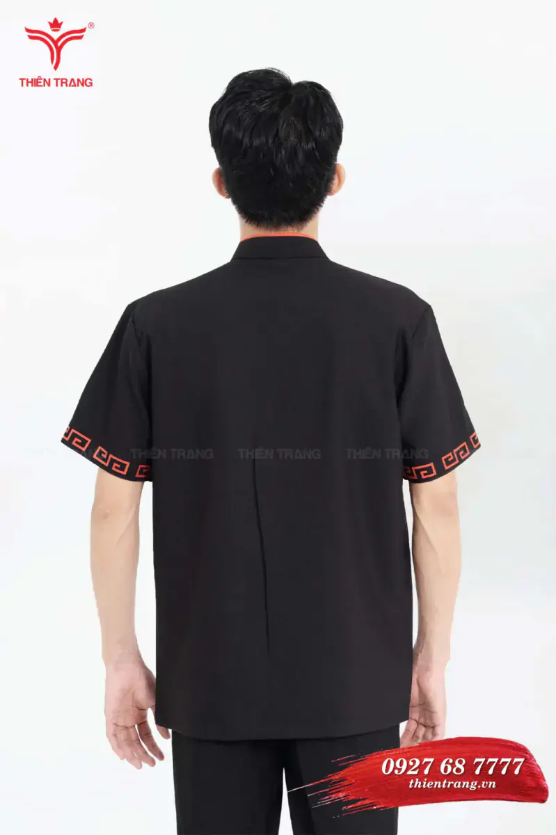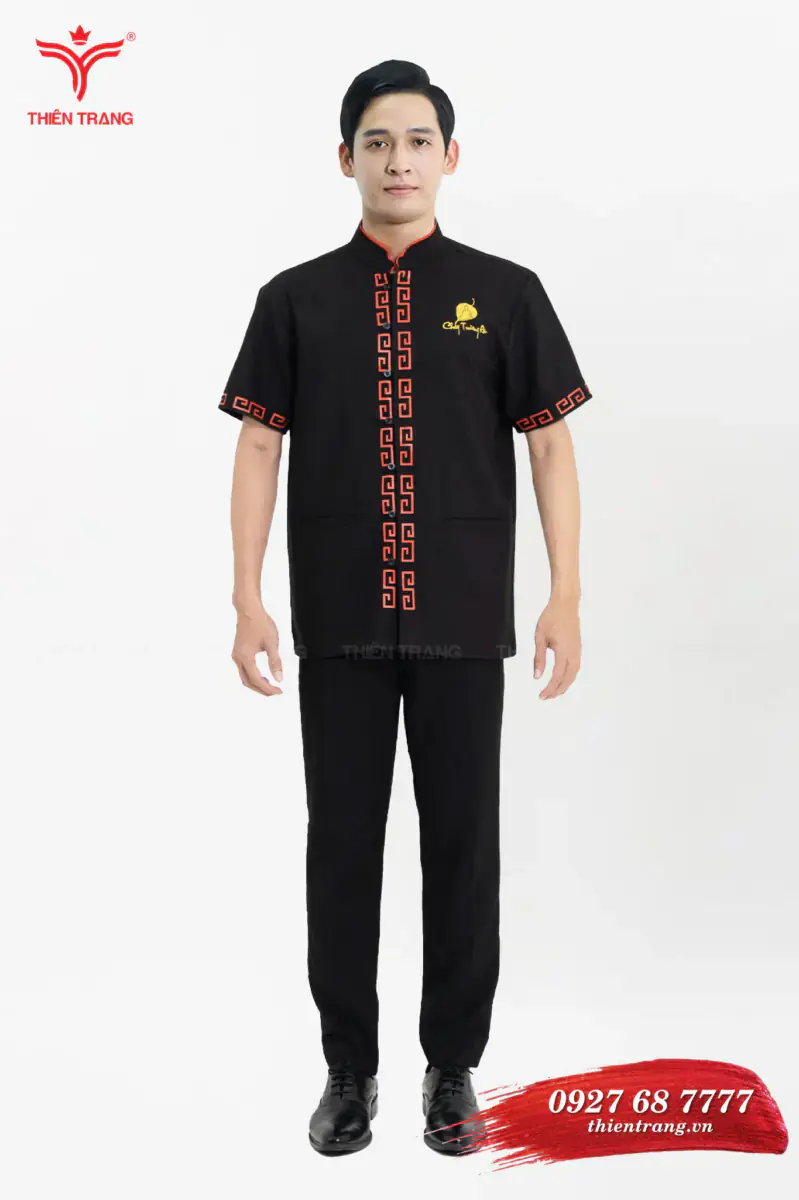 Đồng phục nhà hàng việt TTNHANHVM21 màu đen phối cam là mẫu đồng phục nhà hàng Việt, được thiết kế mang đậm nét truyền thống Việt Nam, họa tiết dân tộc màu cam đơn giản nhưng vẫn tạo nên điểm nhấn tinh tế cho bộ đồng phục.