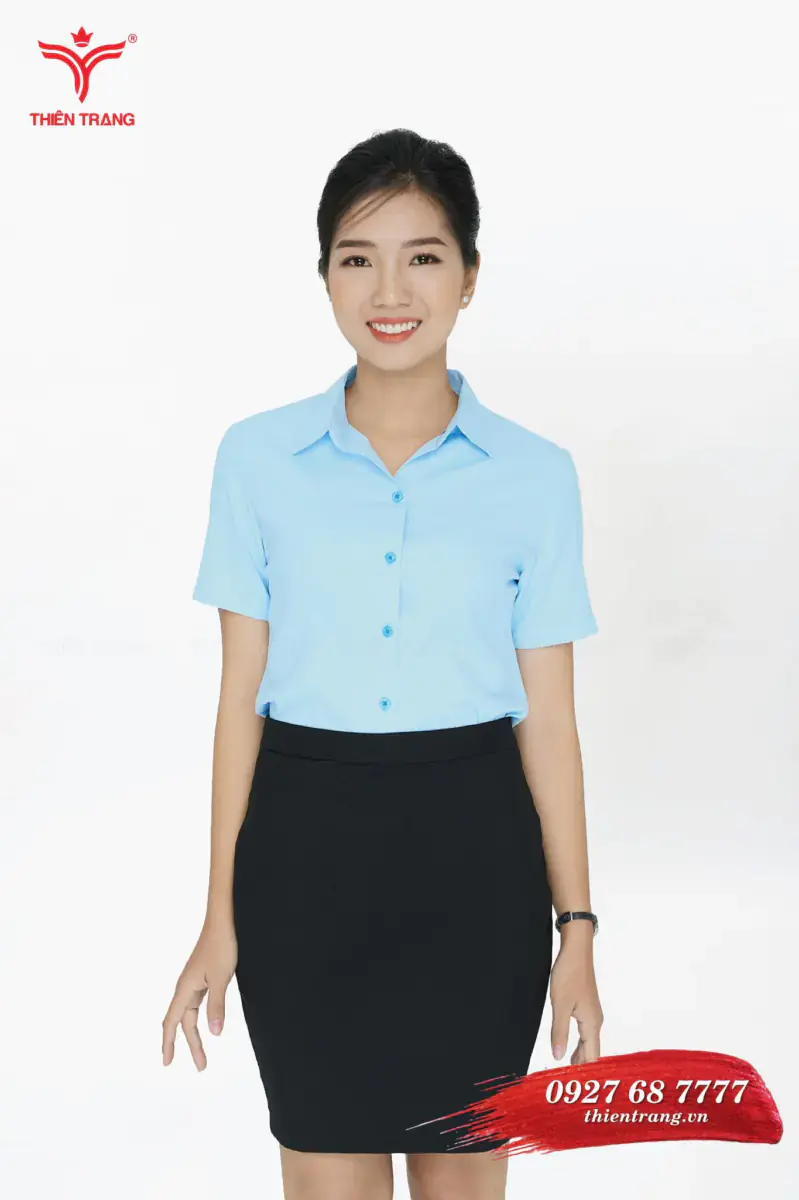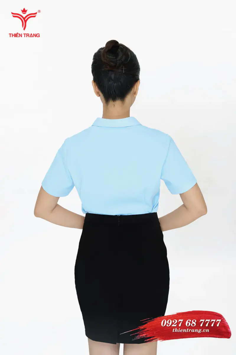 Đồng phục sơ mi nữ tư vấn viên spa TTDNGASM5 màu xanh dương là mẫu đồng phục tư vấn viên spa được thiết kế với áo sơ mi màu xanh ngọc và mẫu váy ngắn đen tạo nên sự chuyên nghiệp và giúp cho người mặc tự tin hơn khi giao tiếp với khách hàng. Nút áo màu xanh dương cũng nổi bật hơn khi được gắn trên áo sơ mi màu xanh.