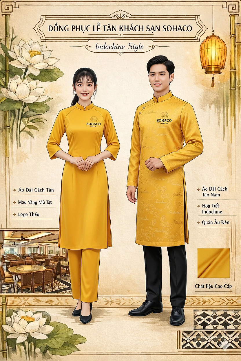 Thiết kế đồng phục lễ tân Khách Sạn Sohaco không chỉ đơn thuần là trang phục làm việc, mà là một ý đồ nghệ thuật đầy tinh tế, kết nối chặt chẽ giữa con người và không gian nhà hàng đậm chất Đông Dương (Indochine). Sắc vàng mù tạt (mustard) rực rỡ và ấm áp của bộ đồng phục như được chắt lọc từ chính những mảng tường vàng, những bức tranh hoa sen trang nhã và ánh đèn ấm áp tỏa ra từ trần nhà gỗ cách điệu của nhà hàng.