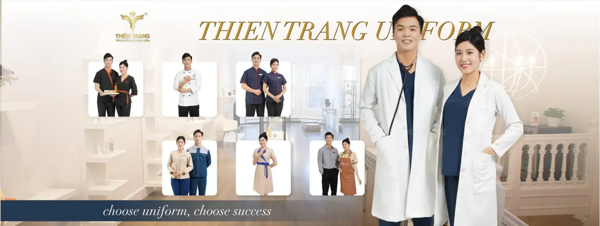 Hình nền của ảnh là một không gian sáng sủa, hiện đại với một số kệ trưng bày. Dòng chữ “choose uniform, choose success” (chọn đồng phục, chọn thành công) xuất hiện ở dưới cùng, nhấn mạnh tầm quan trọng của việc chọn đúng đồng phục trong việc tạo ấn tượng chuyên nghiệp và thành công.